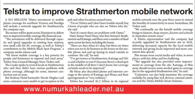 Numurkah Leader, February 21 2018: A $12 million Telstra investment in mobile phone coverage for northern Victoria and Bendigo will include a network upgrade for Strathmerton, the company says.
